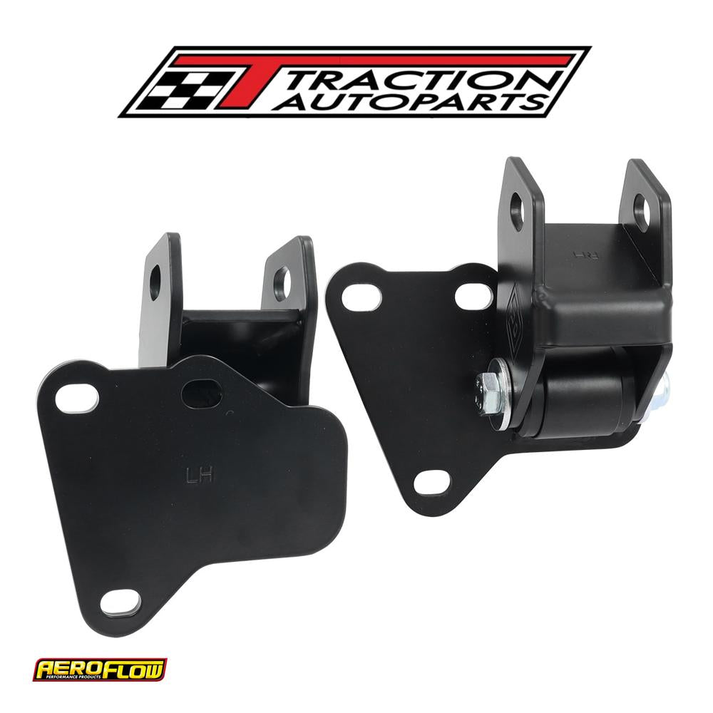 Aeroflow performance engine mounts are a great upgrade for your daily driver,high Aeroflow performance or competition car. Be sure the engine sits in the right placeevery time with these engine mounts that are designed as a direct bolt up for conversion cars and also oem replacement with no extra adapters required. Due to excessive movement the factory oe enginemounts are prone to failure orjust everyday wear and tear. The black polyurethane bushes and high-quality steel mounts isolates the engine from the chassis, resulting in vibration suppression and allowing the power to get to the ground where it is needed. The two-piece bolt together design of these engine mounts allow the end user to split the two halves for ease of removal or installation of theengine to the chassis.