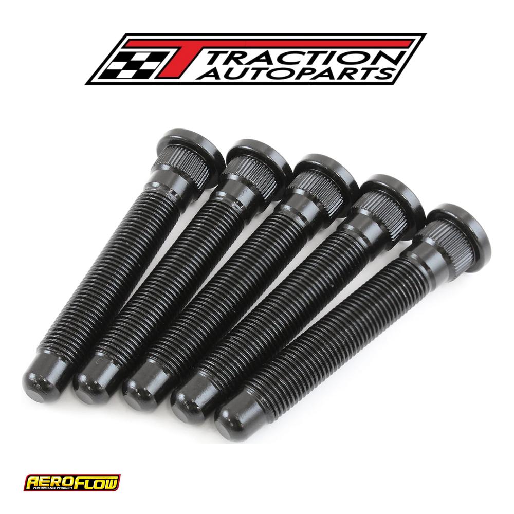 when it comes to your vehicle's wheels, don't take chances. Replace your worn or bent oe wheel studs or upgrade your studs with stronger units with these Aeroflow performance wheel studs. These wheel studs are manufactured from aircraft quality 8740 high tensile strength chrome moly steel and cold-forged to ensure molecular integrity within the stud. Meaning these studs are rated up to 190,000 psi making them stronger than grade 8 and oem fasteners. They can easily handle the tremendous acceleration shock loads and lateral forces found in racing applications. Wheel studs are available in a variety of lengths, knurl and thread sizes to help keep your wheels firmly attached and planted on the ground.