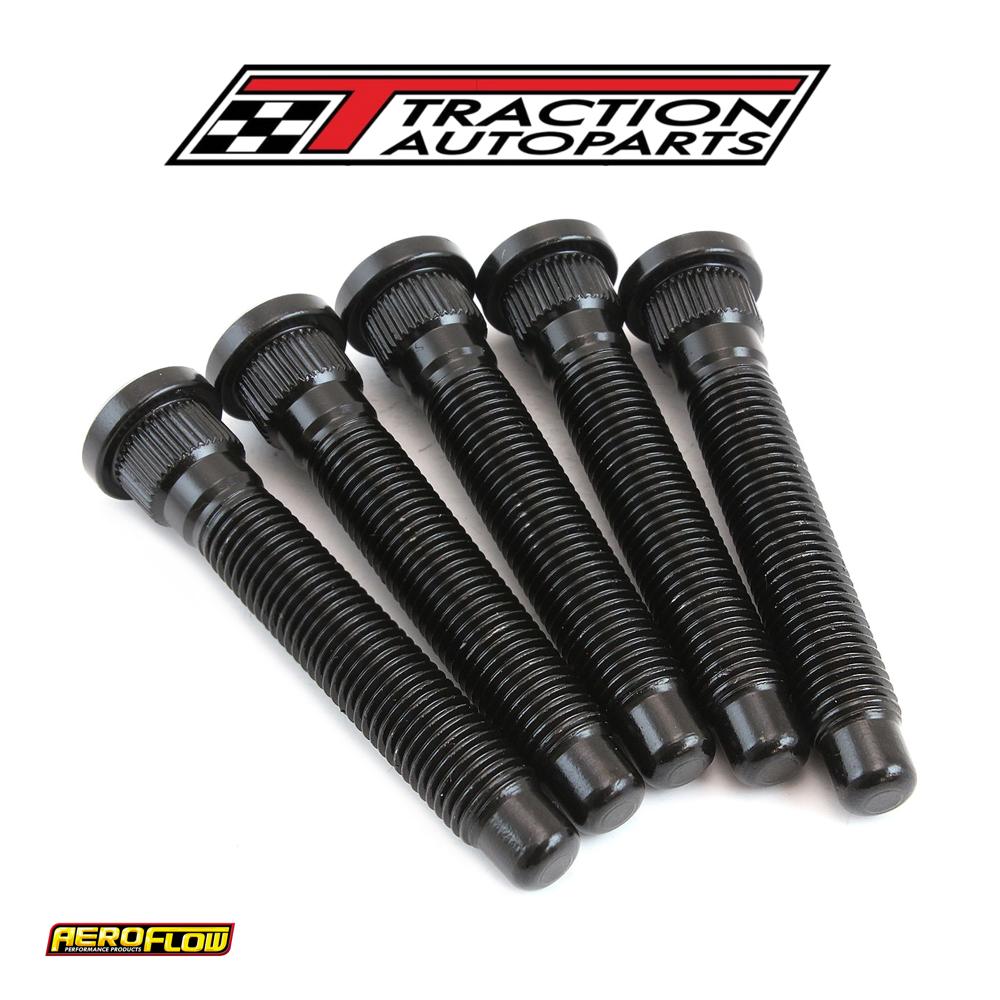 when it comes to your vehicle's wheels, don't take chances. Replace your worn or bent oe wheel studs or upgrade your studs with stronger units with these Aeroflow performance wheel studs. These wheel studs are manufactured from aircraft quality 8740 high tensile strength chrome moly steel and cold-forged to ensure molecular integrity within the stud. Meaning these studs are rated up to 190,000 psi making them stronger than grade 8 and oem fasteners. They can easily handle the tremendous acceleration shock loads and lateral forces found in racing applications. Wheel studs are available in a variety of lengths, knurl and thread sizes to help keep your wheels firmly attached and planted on the ground.