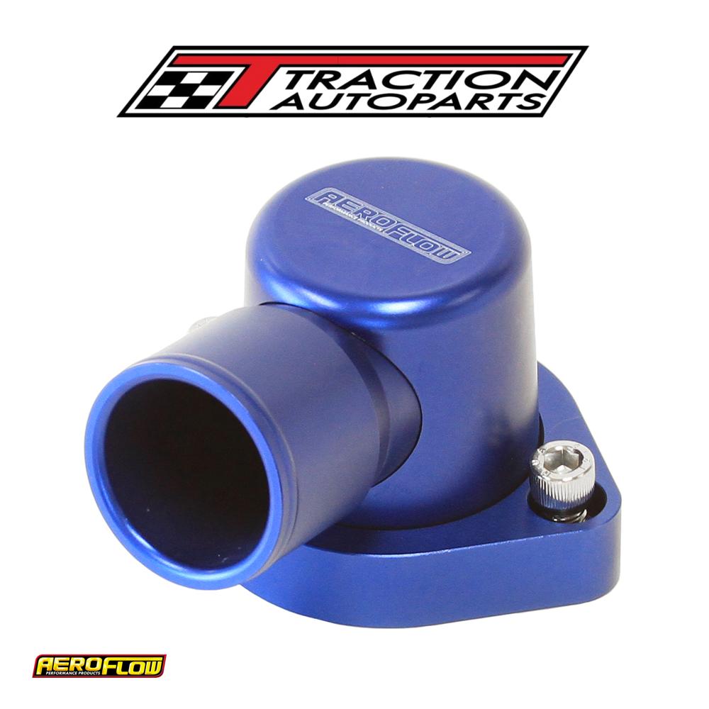 the Aeroflow performance billet thermostat housings area three-piece design that allows for correct positioningof the outlet to suit a large array for applications especially in conversions where small can be an issue. Machined from t6-6061 billet aluminium and allows for a full 360-degree swivel rotation for ease of installation. All Aeroflow performance thermostat housings feature an O-ring base flange, as opposed to using the factory paper style gasket, this ensured a superior leak free seal. Each thermostat housing outlet can be untreated exposing a female1-1/4”-20 thread to adapt a an fitting or a largerbarb fitting for custom applications. Available in several anodised finishes.