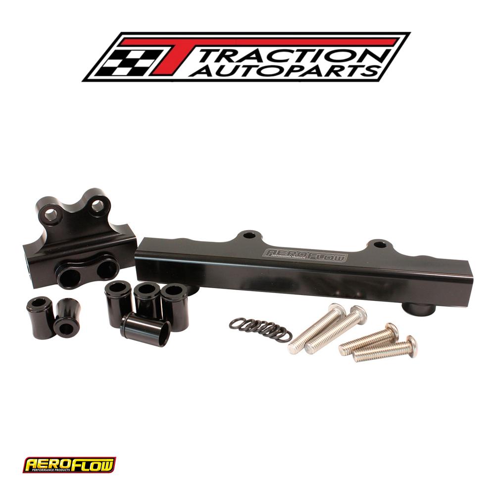 Aeroflow performance mazda rotary fuel rail to suit 13b engines in series 4 and 5 mazda rx7. The high flow primary and secondary fuel rails have an integrated one-piece bracket design. Each rail features female -8orb ports on each end and a large internal bore to support all necessary engine power requirements. Fuel rails are double anodised and are available in blue, black, red and silver finishes.