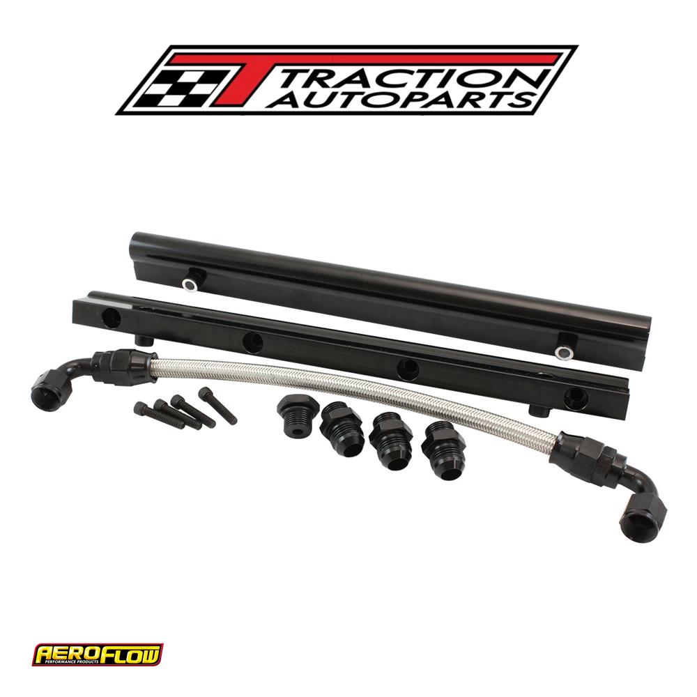 each fuel rail is precision cnc machinedfrom extruded 6063 aluminium with a large internal diameterbore with -8orb ports on each end and anodized black.