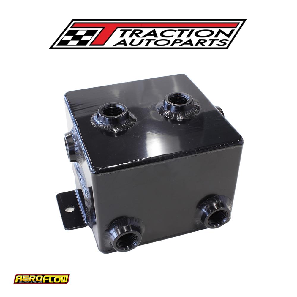 these Aeroflow performance alloy tanks are designed for universal applications. They can be used for such applications including surge tanks, breather tanks, water tanks, vacuum tanks and many more. They are robotically tig welded with 2. 5mm thick aluminium. The tanks feature eight female -8 O-ring ports that allow vast variety of adapter fittings to be placed into various positions around the tank. Note: if not using all ports ensure to block them with fittings (sold separately). This tank has two female -8an o-rings ports located on the top, front and back of tank, also one on each side of the tank above the mounting tabs. This allows multiple locations for plumbing applications.