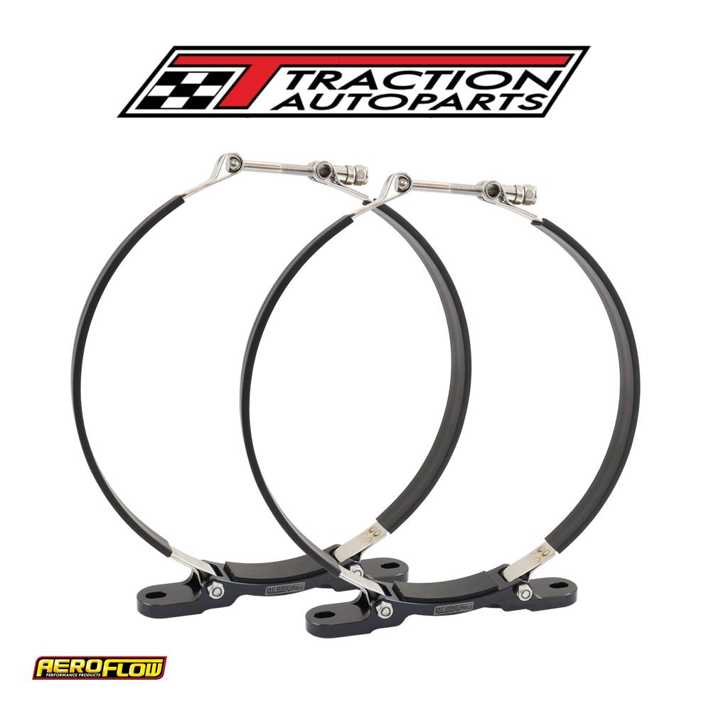 correct mounting of a dry sump tank is important to ensure no damage is incurred to the tank itself under extreme racing conditions with excessive vibrations. The base is constructed from billet aircraft aluminium with a stainless-steel band clamp with interlocking rubber for cushioning on the tank itself for protection. These mounting brackets are specifically made to suit all dry sump tanks in either 6" (152mm) or 9" (228mm) diameter. Sold as a pair in a black anodized finish.