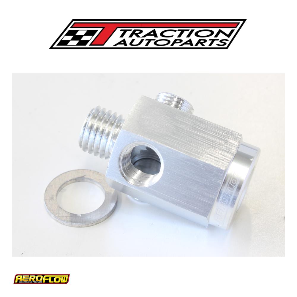 this Aeroflow performance metric extension adapter with the option of three 1/8”npt ports are designed for adapting oil pressure and temperature gauge sensors. It includes two 1/8” npt plugs to block of unused ports. Available in three common metric sizes m12 x 1. 5mm, m14 x 1. 5mm and m16 x 1. 5mm. This adapter is made from 6061-t6 aerospace grade aluminium and available in a blue, black or silver anodisedfinish.