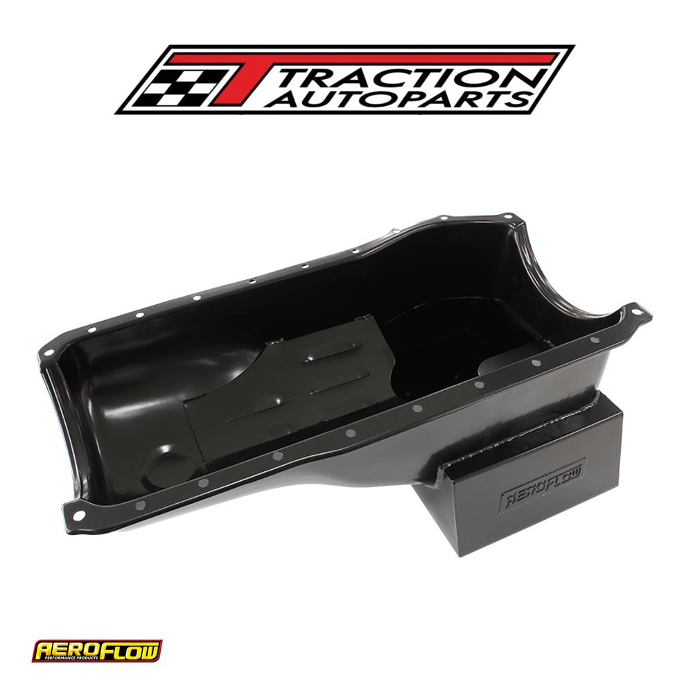 's range of super oil pans available for most popular v8 engines are the perfect choice for street or track driven high Aeroflow performance engines. These pans start out as new stamped steel pans which are customised with specially designed extra oil capacity wings. These wings allow extra oil capacity without affecting ground clearance which helps maintainmore constant oil temperaturesfor reliability and feature windage trays and crank scrapers. Available in black finish. Pans have 6. 5 litre (6. 86 us quarts) capacity.