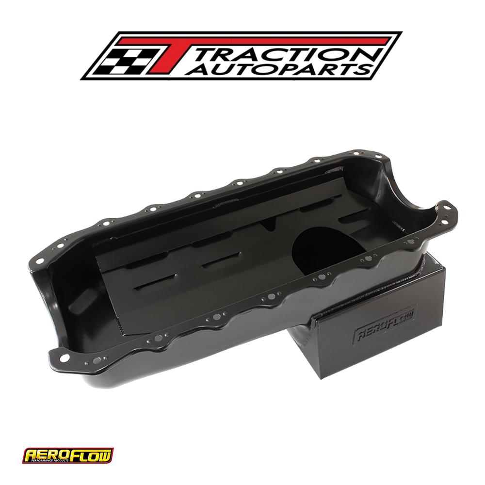 's range of super oil pans available for most popular v8 engines are the perfect choice for street or track driven high Aeroflow performance engines. These pans start out as new stamped steel pans which are customised with specially designed extra oil capacity wings. These wings allow extra oil capacity without affecting ground clearance which helps maintain more constant oil temperatures for reliability and feature windage trays and crank scrapers. Oil pick-ups are supplied for conversion pans where the factory style pick-up will not work. Available in black finish.