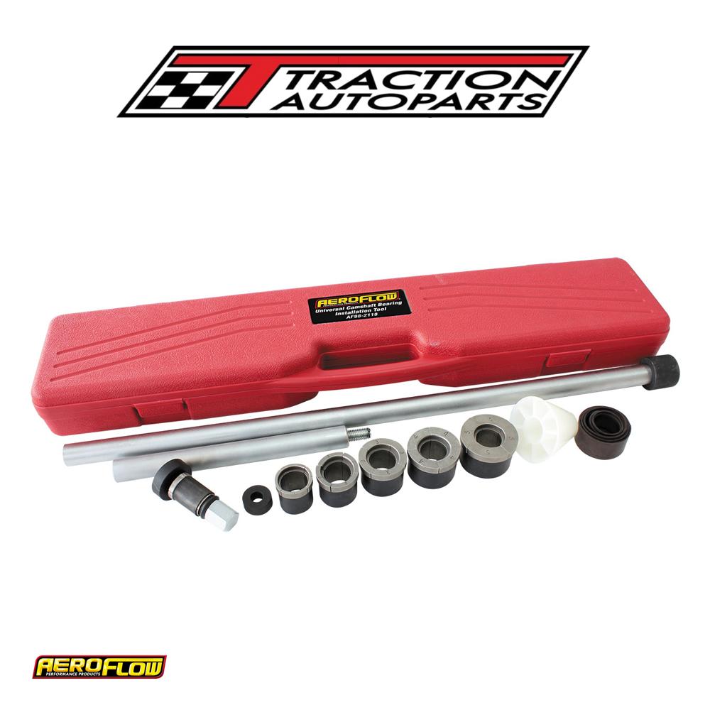 drive camshaft bearings out easily and install new ones like a professional with the Aeroflow performance universal camshaft bearing installation tool. This tool is designed to remove or insert camshaft bearings accurately installing them into any engine block from compact cars to heavy trucks. The expanding sleeves feature a neoprene finish to protect the inner surface of the bearings and to drive the camshaft bearings smoothly into the engine block.