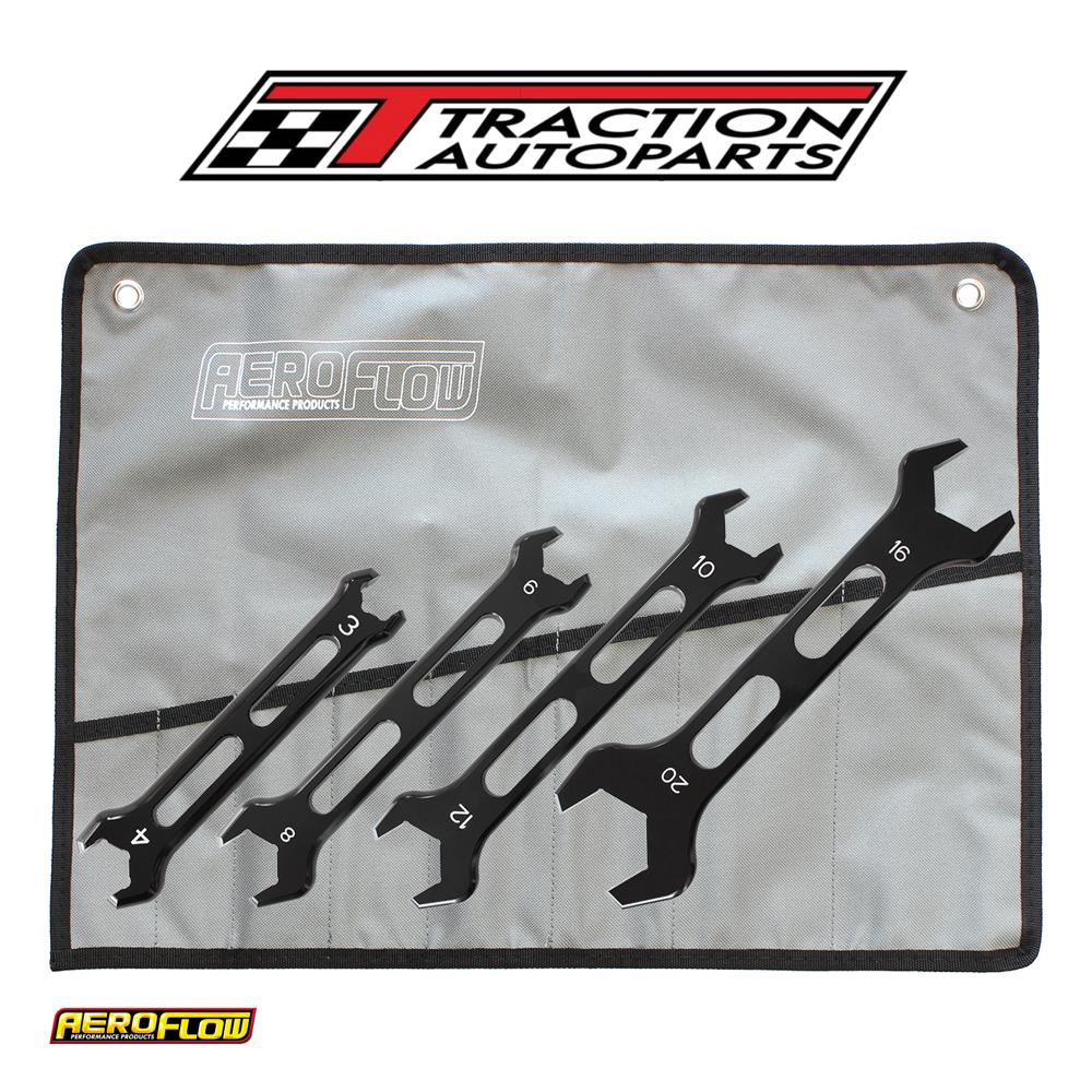 the pro an spanner / wrench is perfect for all hose end assemblies and adapter fittings, providing a perfect fit so they won't mark your fittings. They are slimline enough to get into all corners of tight spacers. All aluminium spanners are hard anodized black and size stamped. Being a double ended spanner set they will fit designed to suit b nuts of an fittings, including 7 sizes from -3an to -20an in this 4 piece kit. Recommended to also use in conjunction with the Aeroflow performance adjustable spanners or vice jaws to install braided hose to fittings. Available in a complete kit with a pro spanner roll up bag for protection included or each pro an spanner is sold separately as well.