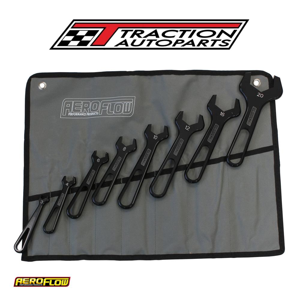 the pro an spanner / wrench is perfect for all hose end assemblies and adapter fittings, providing a perfect fit so they won't mark your fittings. They are slimline enough to get into all corners of tight spacers. All aluminium spanners are hard anodized black and size stamped. Being a single ended spanner set they will fit designed to suit b nuts of an fittings, including 8 sizes from -3an to -20an in a 8 piece kit. Recommended to also use in conjunction with the Aeroflow performance adjustable spanners or vice jaws to install braided hose to fittings. Available in a complete kit with a pro spanner roll up bag for protection included or each pro an spanner is sold separately as well.